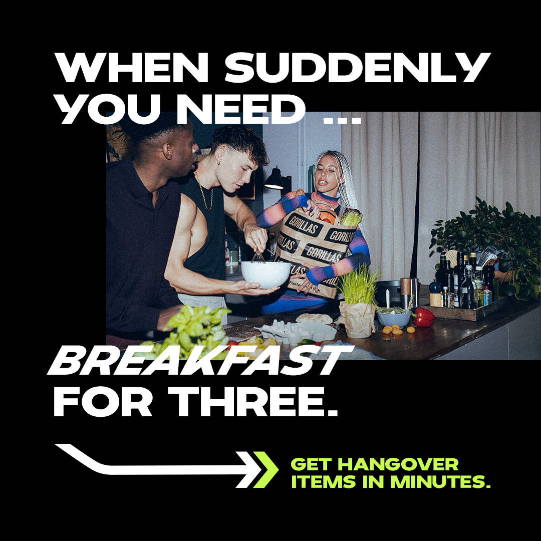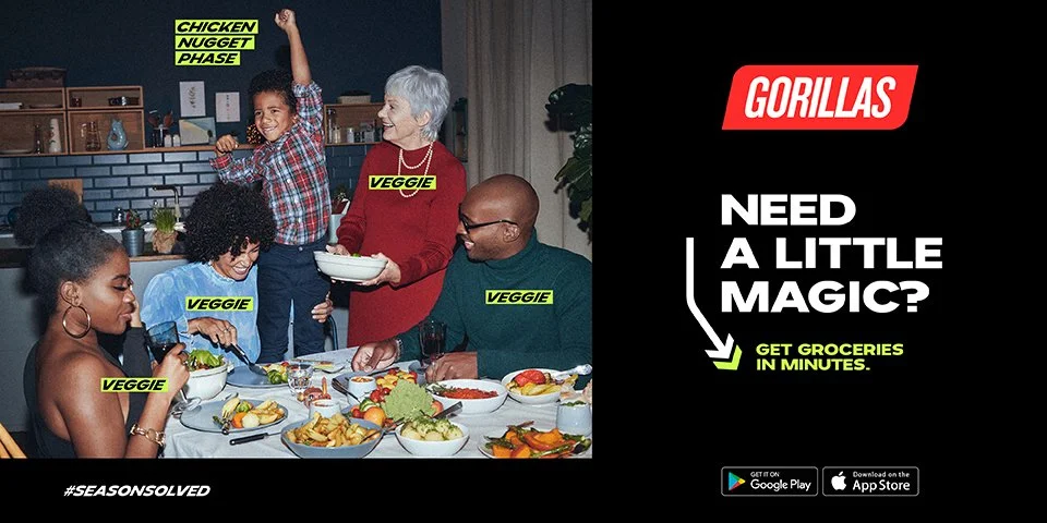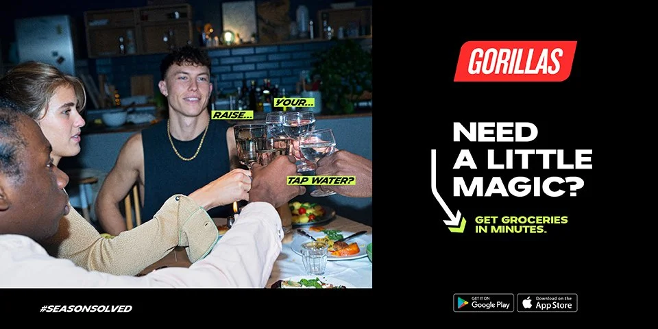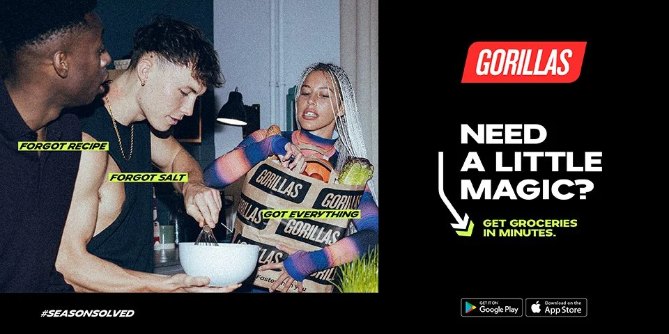 End of Year, 2021 - In their first-ever worldwide holiday campaign, on-demand grocery delivery service GORILLAS introduces an endless number of moments where it delivers a little bit of magic, solving spur-of-the-moment emergencies - seasonal or not - within 10 minutes in New York, London, Paris, Amsterdam, Milan, Madrid, and Berlin. #seasonsolved